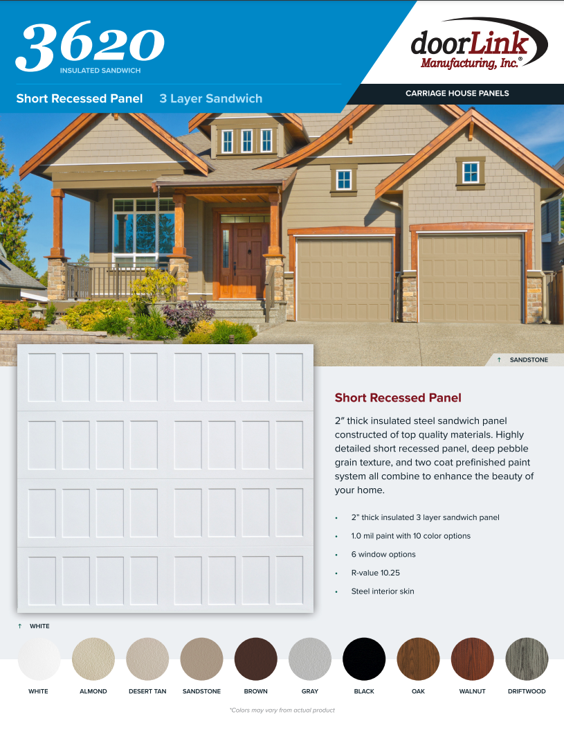 2″ thick insulated sandwich panel constructed of top quality materials. Highly detailed short recessed panel, deep pebblegrain texture and two coat prefinished paint system all combine to enhance the beauty of your home.
